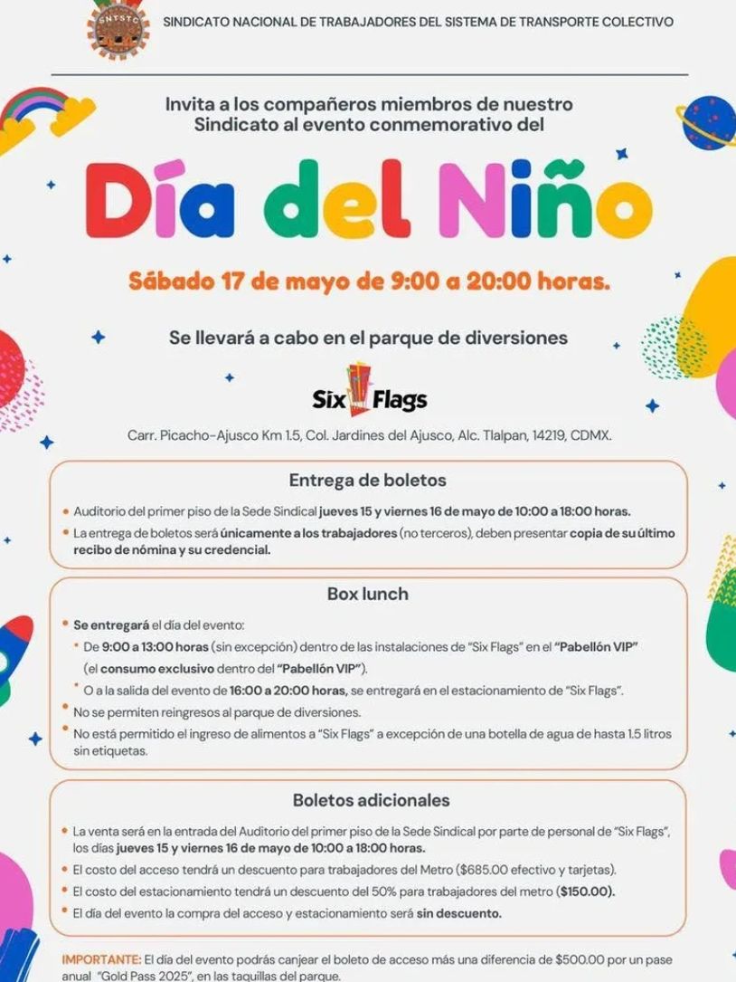 A las compañeras y compañeros que sus derechohabientes cubran la edad de hasta 10 años 11 meses y 28 días, cumplidos hasta el 30 de abril del 2025, se les informa las fechas para acudir a la entrega de boletos del evento con motivo del "Día del Niño". Los niños de 0 años a 4 entran sin boleto.