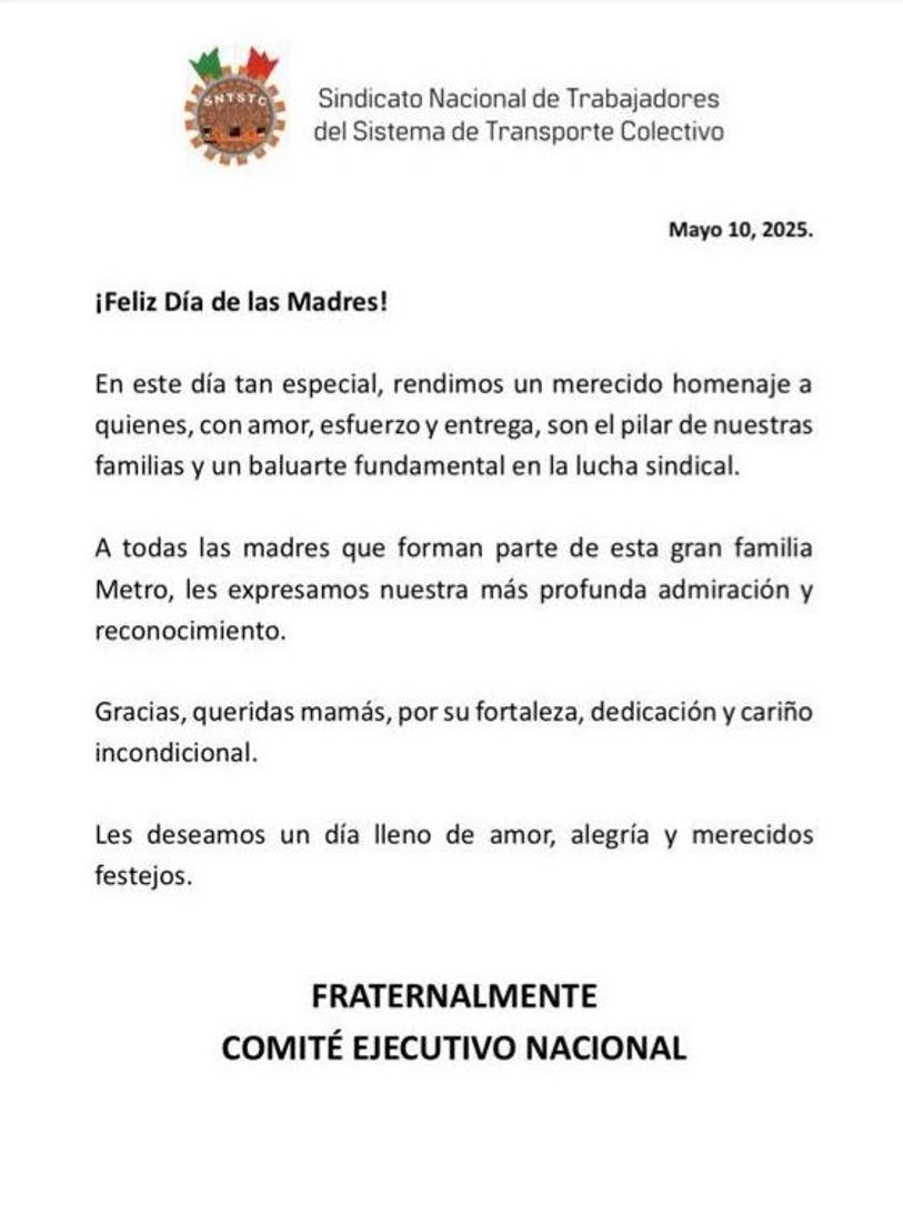 El SNTSTC convoca a los Trabajadores del Metro a la unidad a fin de fortalecer la lucha sindical para la defensa de nuestros derechos laborales adquiridos a partir de la lucha viril y combativa, que a través de los años hemos mantenido, lo que se consolida con el trabajo diario que con eficiencia, eficacia, responsabilidad y esfuerzo realizamos en nuestras diferentes áreas de trabajo, en beneficio de más de 5.4 millones de usuarios día a día.